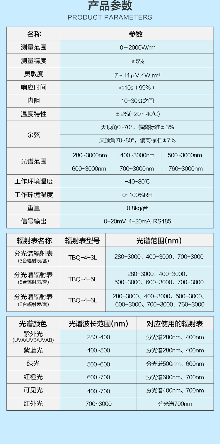 TBQ-4系列分光譜輻射表精準(zhǔn)地測(cè)量太陽總輻射量以及紅外光譜區(qū)、可見光譜區(qū)和紫外光譜區(qū)的太陽輻射量。用戶可根據(jù)具體需求自由選配調(diào)整,實(shí)現(xiàn)個(gè)性化的測(cè)量方案。這款太陽分光譜輻射表不僅具備高精度的測(cè)量能力,還能深入分析太陽光譜,為用戶提供一系列關(guān)鍵性的太陽輻射數(shù)據(jù)。通過精確分類不同波長(zhǎng)的太陽輻射,幫助我們更全面地了解太陽的行為和性質(zhì),為科研、工業(yè)應(yīng)用及環(huán)境監(jiān)測(cè)等領(lǐng)域提供強(qiáng)有力的數(shù)據(jù)支持。
