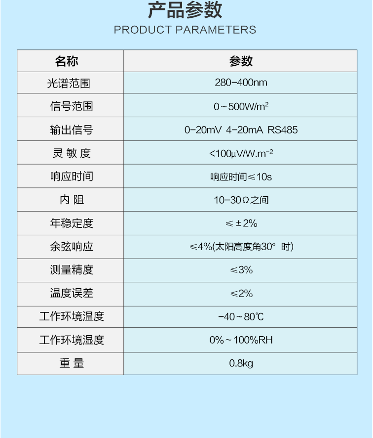 TBQ-UVAB紫外輻射傳感器用于測(cè)量和記錄環(huán)境中280-400nm的紫外輻射強(qiáng)度的一款高性能的環(huán)境監(jiān)測(cè)設(shè)備。產(chǎn)品特點(diǎn)在于其高精度、快速響應(yīng)和穩(wěn)定性強(qiáng),能夠準(zhǔn)確捕捉并反映紫外輻射的變化情況。無(wú)論是在氣象觀(guān)測(cè)、環(huán)境監(jiān)測(cè)、皮膚健康研究還是戶(hù)外工作場(chǎng)所的安全評(píng)估中,紫外輻射表都發(fā)揮著至關(guān)重要的作用。它能夠幫助我們更好地了解紫外輻射對(duì)環(huán)境及人體健康的影響,為相關(guān)領(lǐng)域的科研、政策制定及安全預(yù)警提供有力支持。