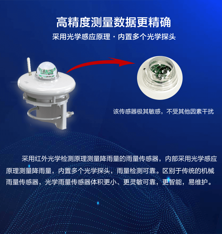 LC-GYL1光學(xué)雨量傳感器是一種通過(guò)高精度光學(xué)元件感知雨滴的密度和速度,實(shí)現(xiàn)實(shí)時(shí)、準(zhǔn)確的降雨量監(jiān)測(cè)傳感器。內(nèi)置多個(gè)光學(xué)探頭,結(jié)合可靠的遙測(cè)算法,使得傳感器在測(cè)量降雨量時(shí)表現(xiàn)出色,其靈敏度相較于傳統(tǒng)翻斗式雨量計(jì)提高了100倍。此外,該傳感器還具有長(zhǎng)壽命、低功耗設(shè)計(jì),以及免維護(hù)的特點(diǎn),使得其在各種惡劣環(huán)境下都能穩(wěn)定運(yùn)行。廣泛應(yīng)用于惡劣環(huán)境下的自動(dòng)雨量監(jiān)測(cè)。在暴雨、山洪、泥石流等災(zāi)害性降水天氣的自動(dòng)監(jiān)測(cè)、預(yù)警中起著關(guān)鍵作用。
