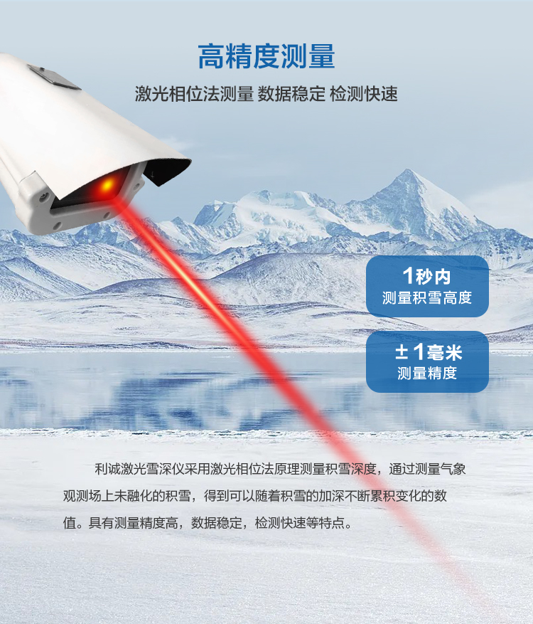 激光雪深儀采用激光相位法原理測量積雪深度,通過測量氣象觀測場上未融化的積雪,得到可以隨著積雪的加深不斷累積變化的數(shù)值。具有測量精度高,數(shù)據(jù)穩(wěn)定,檢測快速等特點。