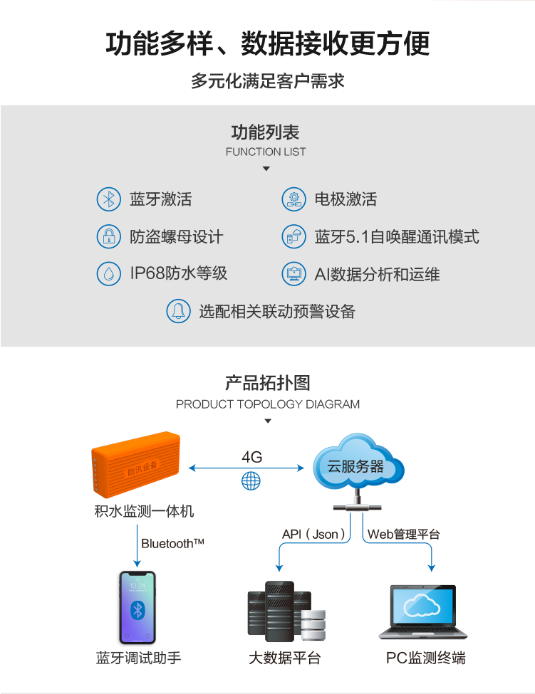 DC-JS31三合一積水監(jiān)測儀是一款針對城市道路、涵隧、下沉立交、地下車庫等安裝空間有限的場景開發(fā)的水位監(jiān)測設(shè)備。高度融合了多種微傳感、物聯(lián)網(wǎng)、移動(dòng)互聯(lián)等先進(jìn)技術(shù),實(shí)現(xiàn)無需外部供電的情況下的積水探測、洪澇預(yù)警、遠(yuǎn)程控制等功能,具有體積小巧、安裝運(yùn)維便捷、響應(yīng)迅速、智能化程度高、延展性好等突出優(yōu)勢。