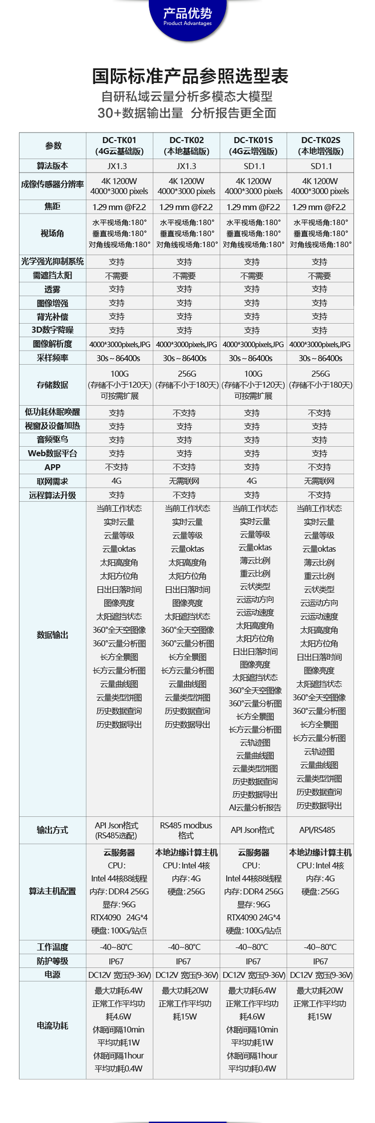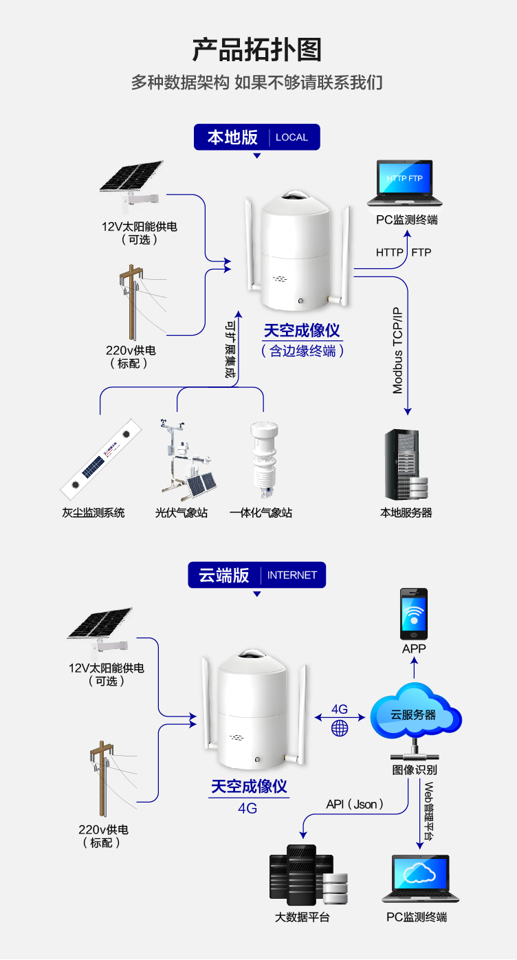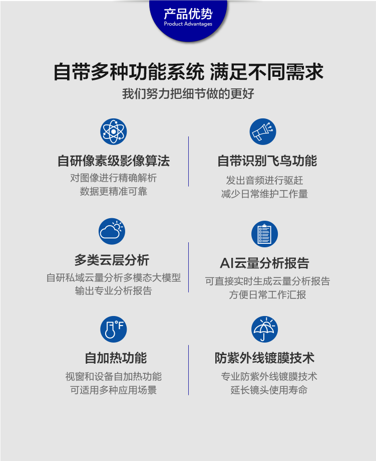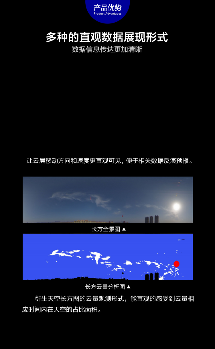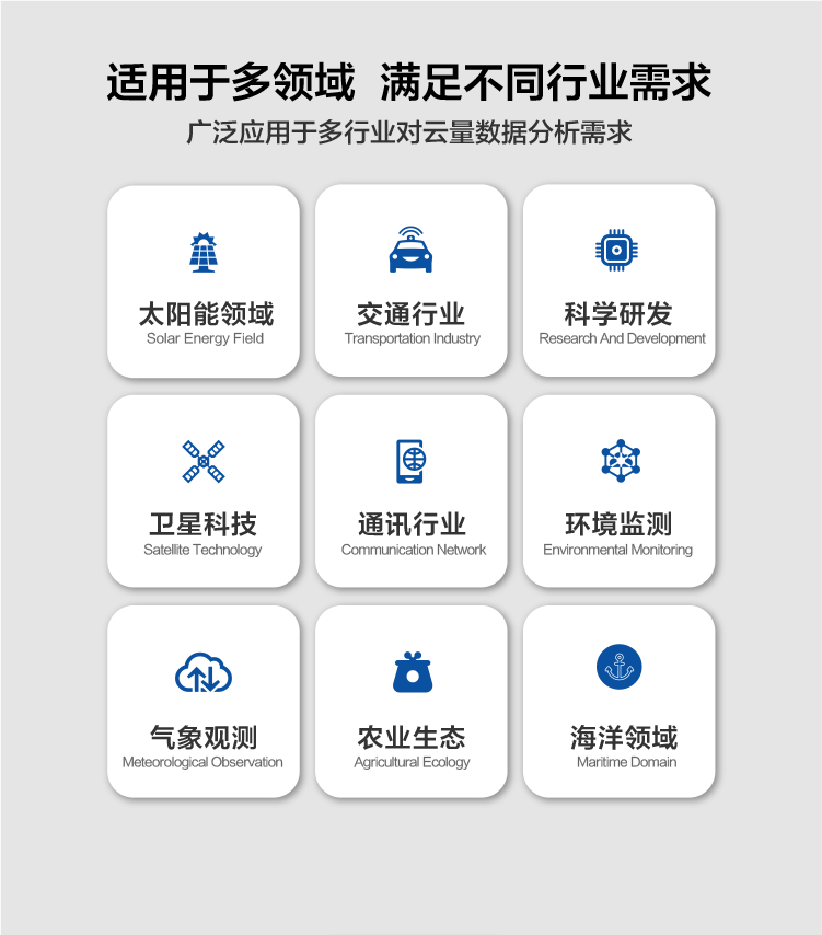DC-TK系列全天空成像儀是一種用于監(jiān)測(cè)天空云量的儀器設(shè)備。它是由一系列的光學(xué)鏡頭、濾光片、光電傳感器以及視覺處理設(shè)備組成。全天空成像儀可以在無(wú)太陽(yáng)遮擋而完全暴露在太陽(yáng)光照之下清晰捕捉天空的圖像,并通過深度學(xué)習(xí)技術(shù)的云視覺算法分析天空?qǐng)D像中的云量、云狀、云軌跡等參數(shù),可以用于,應(yīng)用領(lǐng)域氣象觀測(cè)、環(huán)境監(jiān)測(cè)、氣候研究、天氣預(yù)報(bào)、太陽(yáng)能評(píng)估及監(jiān)測(cè)、光功率預(yù)測(cè)、電站設(shè)計(jì)、農(nóng)林生態(tài)建筑設(shè)計(jì)及衛(wèi)星驗(yàn)證等領(lǐng)域。